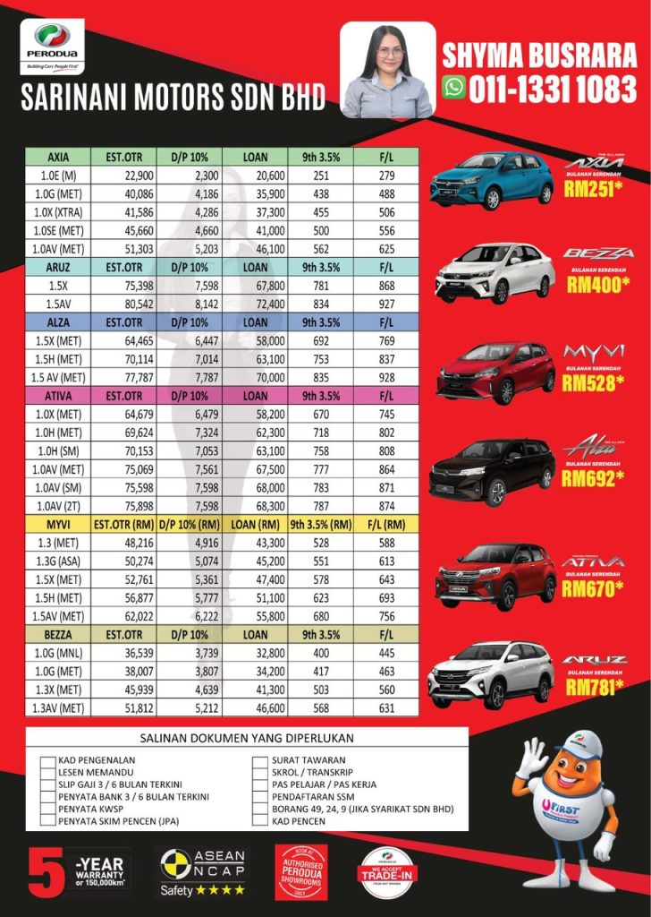 Hubungi saya sekarang untuk tempah kereta Perodua idaman anda. Saya sedia membantu anda merialisasikan impian anda untuk memiliki kereta Perodua.